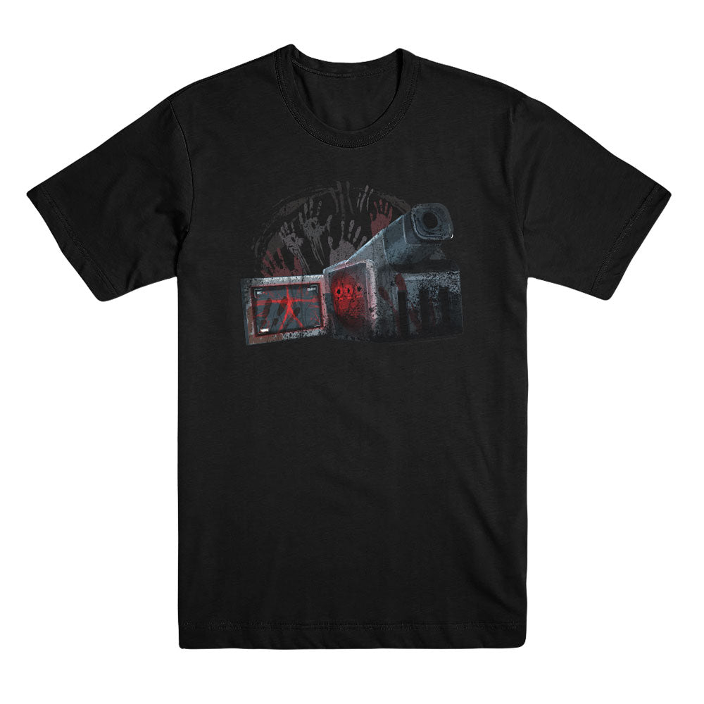 Uncover the mysteries of the Blair Witch with this tee adorned with a camera surrounded by blood-stained handprints and the legendary stick figure totem. Made from 90% airlume combed and ring-spun cotton, 10% polyester.  Pre-shrunk.
