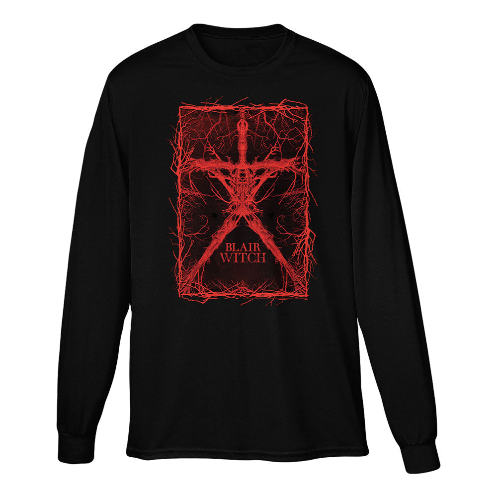 This long sleeve tee features the iconic stick figure totem of the Blair Witch framed in twine.  Made from 100% cotton preshrunk jersey featuring ribbed cuffs with concealed seam, double needle stitched bottom hem.