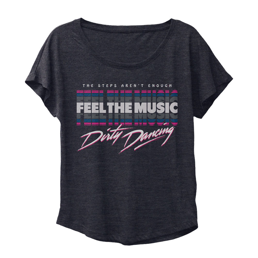 Keep the beat alive with this dolman tee. This charcoal dolman features Johnny's words, the steps aren't enough, feel the music with the Dirty Dancing logo.