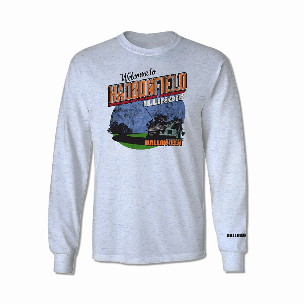 A unisex heather gray long sleeve tee featuring a Welcome to Haddonfield, Illinois design. Sizes range from S-3XL.