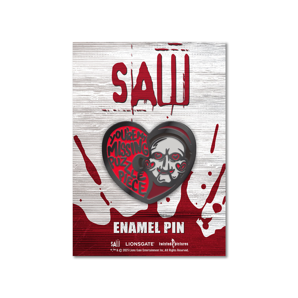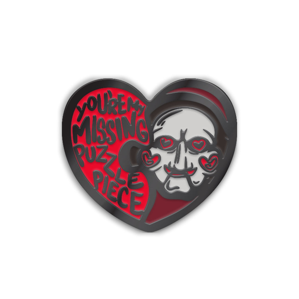 Profess your love with this heart shaped enamel pin featuring Billy the Puppet and the phrase "You're My Missing Puzzle Piece."