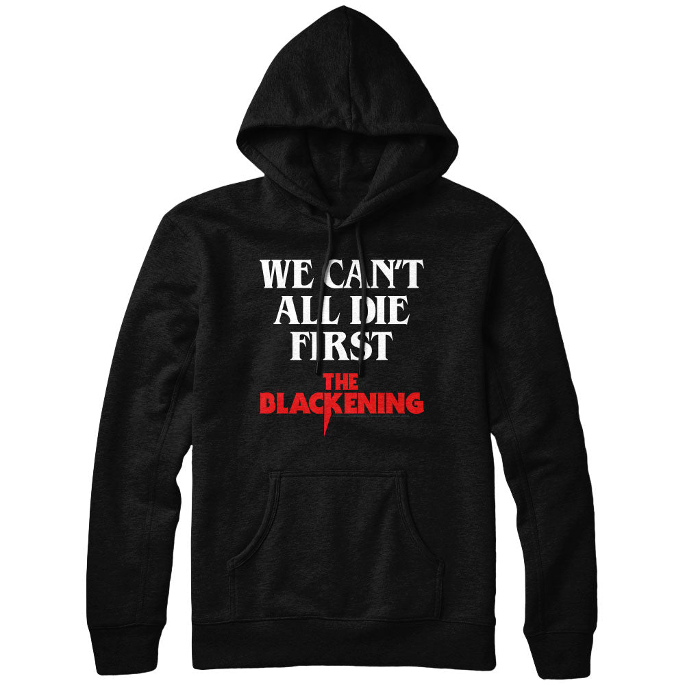 Even in life-or-death situations, someone has to be positive, right? Sport this We Can't All Die First black hoodie from The Blackening.