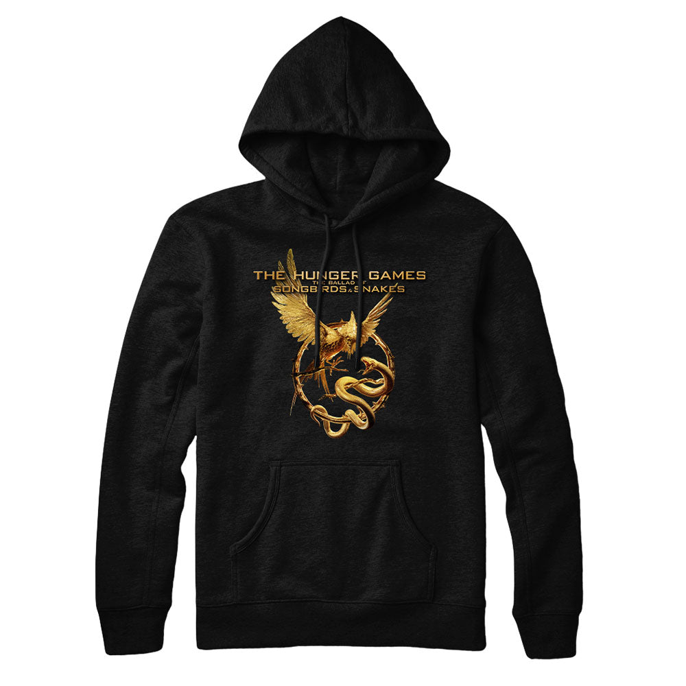 Represent both songbirds and snakes with this black hoodie featuring the emblem and logo for The Hunger Games: The Ballad of Songbirds and Snakes.