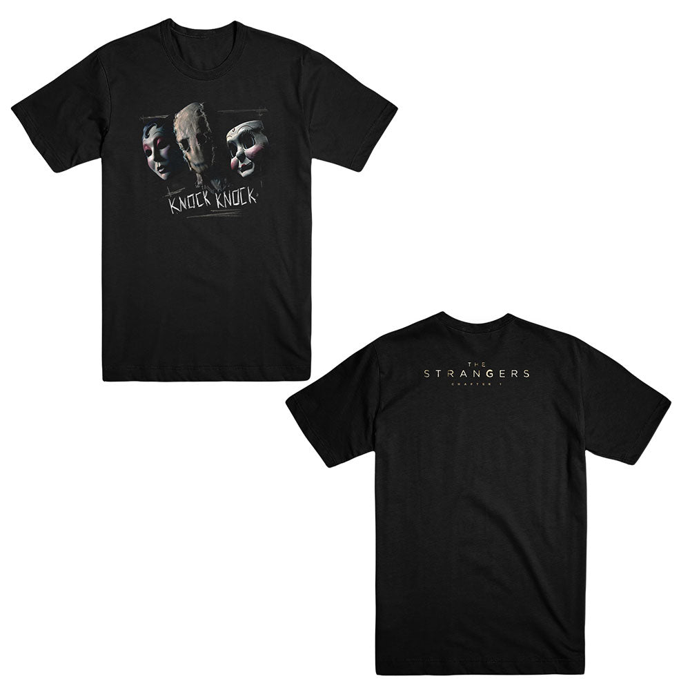 Don't talk to strangers...This tee features the words "Knock Knock" and the three masked visitors from The Strangers: Chapter 1.