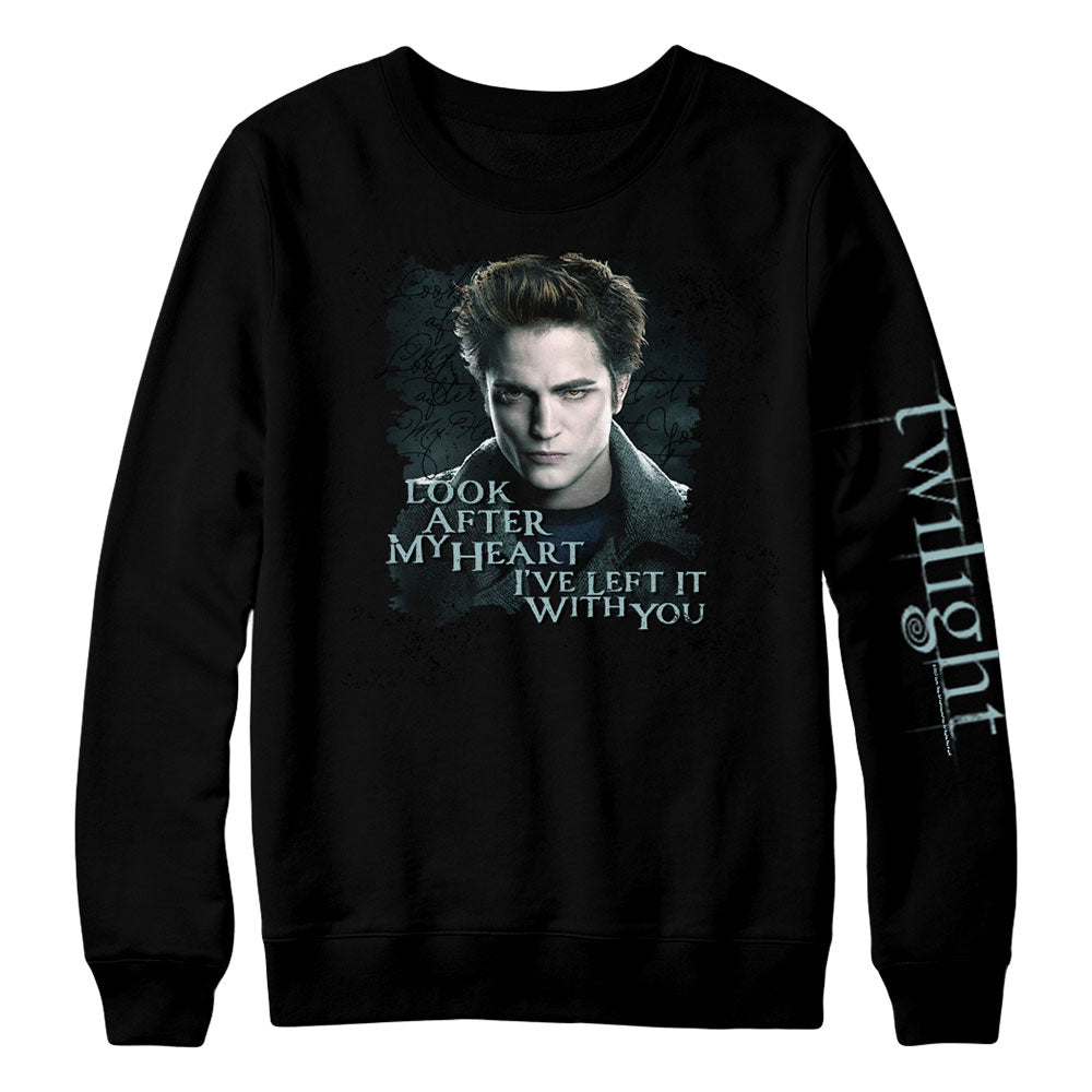Step out in this cozy crewneck featuring Edward and his romantic quote to Bella Look after my heart, I've left it with you.